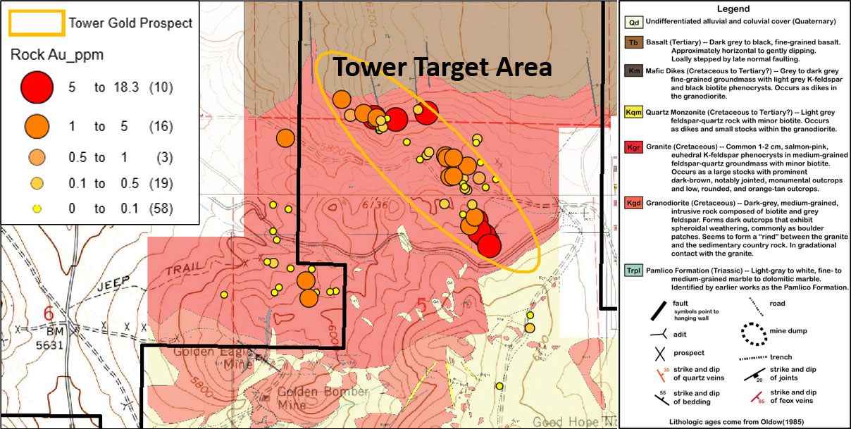 The permitted TOWER GOLD TARGET drill program will test a +400 metres long, by up to 100 metre wide, zone of anomalous gold in soil and bedrock. The TOWER GOLD TARGET is interpreted as potentially representing a distal gold system to a porphyry Cu deposit or another event of the Walker Lane trend.