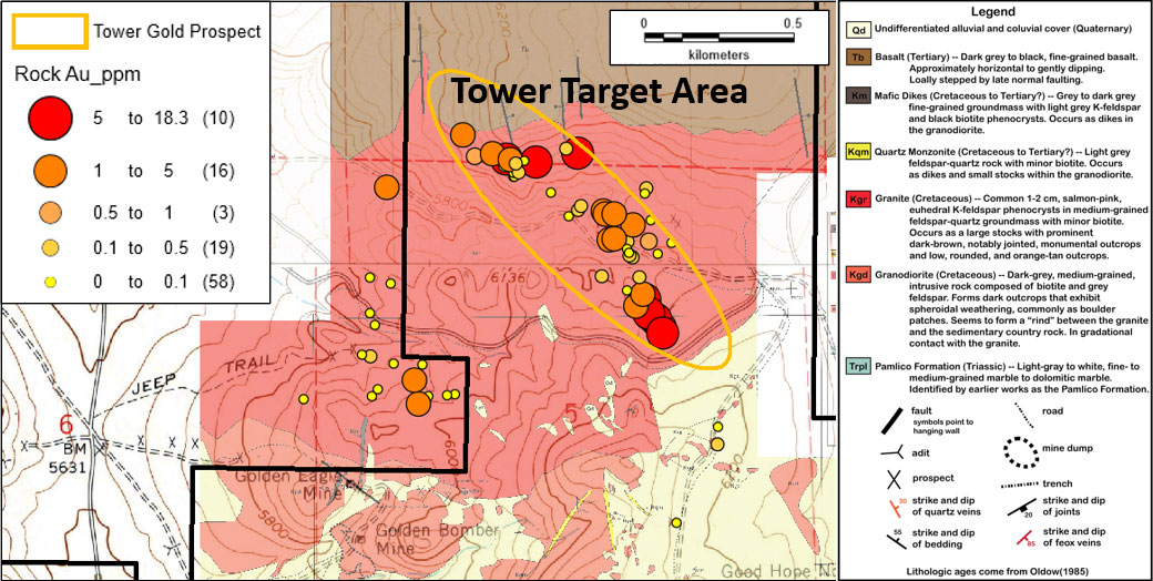 The Golden Bomber Target covers two historic prospects, known as the Golden Bomber and Golden Eagle mines, located about 1.1 kilometers Southwest of the southern portion of the Tower Gold Target (see Press Release September 5, 2025). Sampling by the Company in 2017 returned gold values up to 25.90 grams per tone (g/t Au), silver values up to 318.0 g/t Ag and copper peaks of 6.14 per cent Cu from surface samples over an area of approximately 300 by 200 metres. The 2017 sampling program highlighted 11 rock samples (grab and chip samples) and were reported on January 16, 2018. Since 2018, the Company has been able to stake additional strategic claims to better cover the Golden Bomber Target.