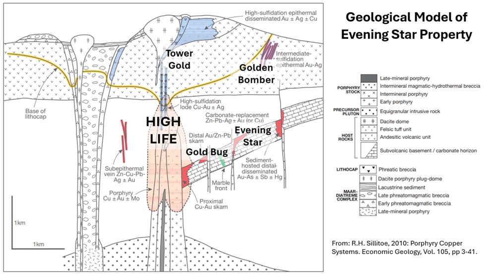 Figure 4. Sillitoe’s 2010 copper-gold porphyry model showing position of Evening Star gold and copper targets within the greater context of the porphyry system.